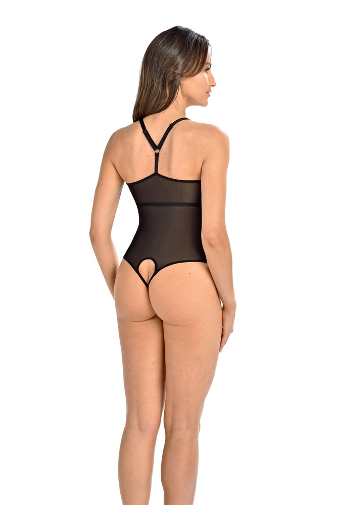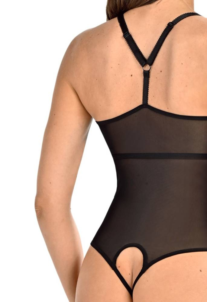 Damskie body z prześwitującej siatki w kolorze czarnym.