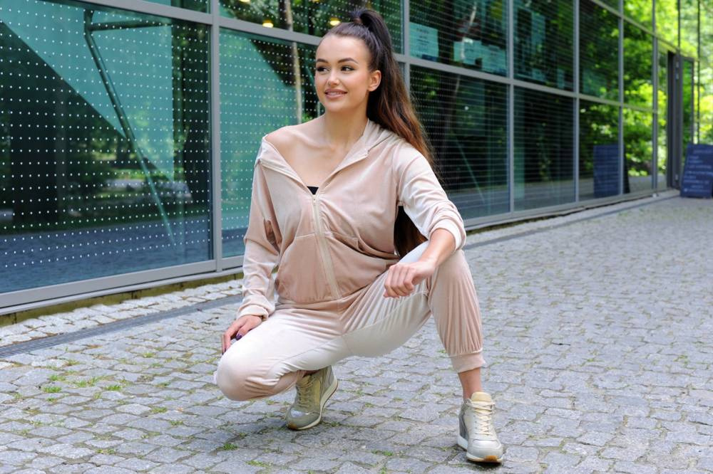 Niezwykle komfortowy komplet dresowy uszyty z delikatnego weluru. W komplecie rozpinana bluza z kieszeniami oraz długie spodnie zakończone ściągaczem.