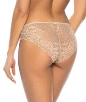 Figi damskie wykonane z beżowej dzianiny z lekkim połyskiem. Z przodu fig koronkowa wstawka, tył również koronkowy, który pięknie podkreśla kobiece wdzięki.