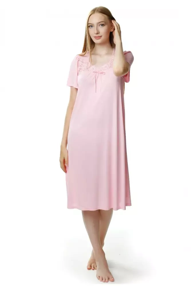 .Koszula nocna wykonana z dzianiny wiskozowej z krótkim rękawem o długości - za kolano. Elementem zdobniczym jest zastosowanie elastycznej, miękkiej koronki o motywie kwiatowym, która nadaje uroku i kobiecości. Całość dopełnia delikatna kokardka.