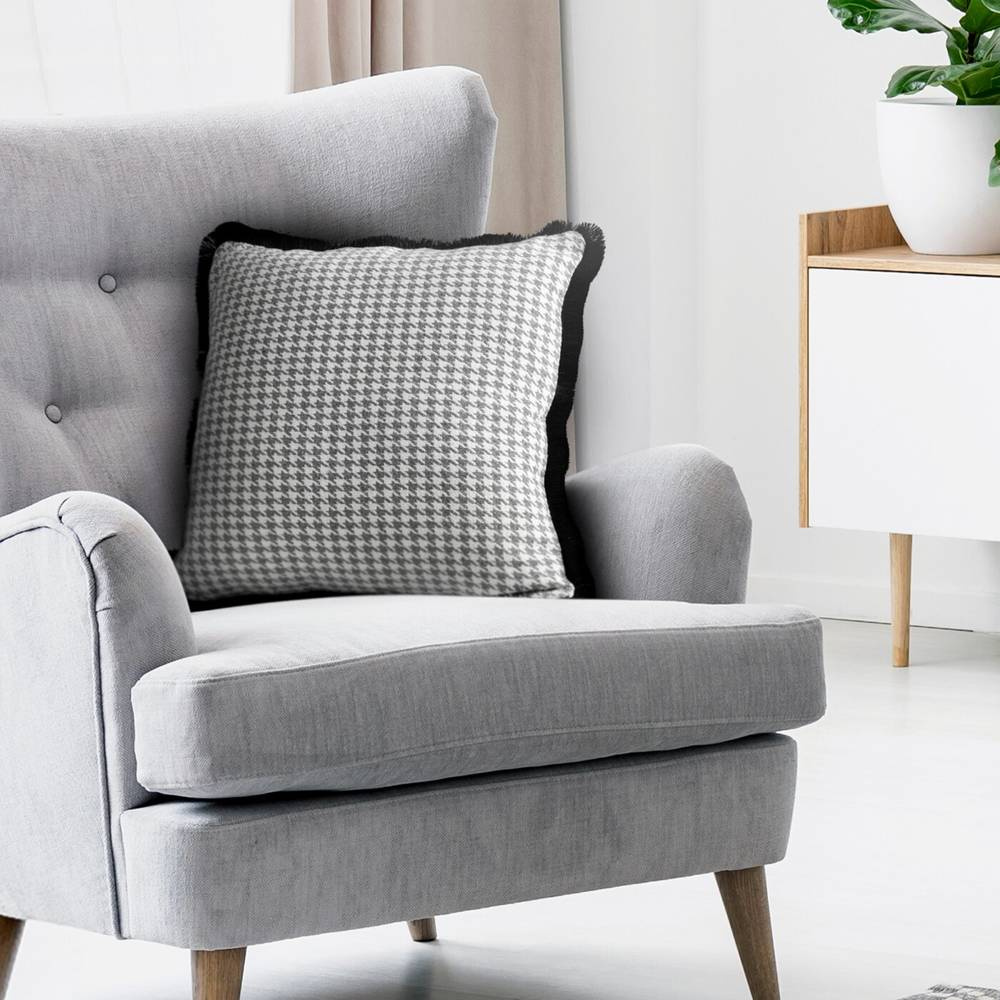 Poszewka wykonana z miękkiego, połyskującego i mieniącego się welwetu. Model w czarno-białą pepitkę podkreśla na brzegach ozdobne obszycie z miękkich frędzli. Pozwala w prosty i szybki sposób upiększyć każde wnętrze.