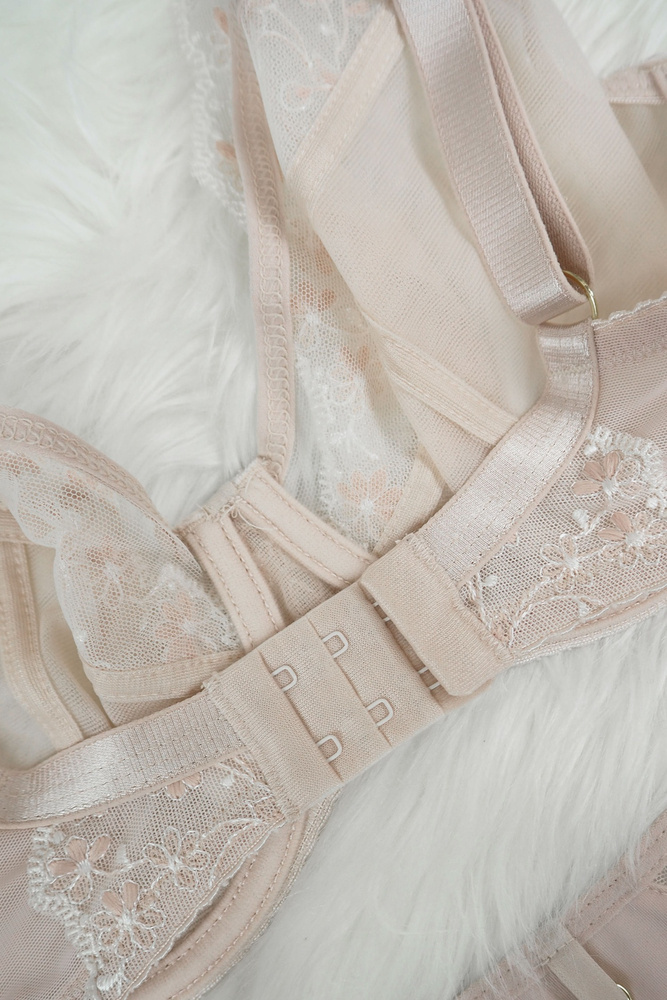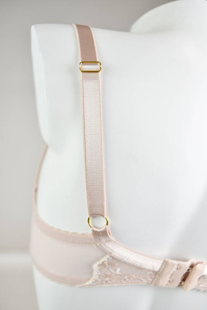 Biustonosz miękki. Miseczki wykonane z siatki konstrukcyjnej wysokiej jakości, na którą naszyta została koronka z motywem kwiatowym. Konstrukcja doskonała na średni i duży biust.