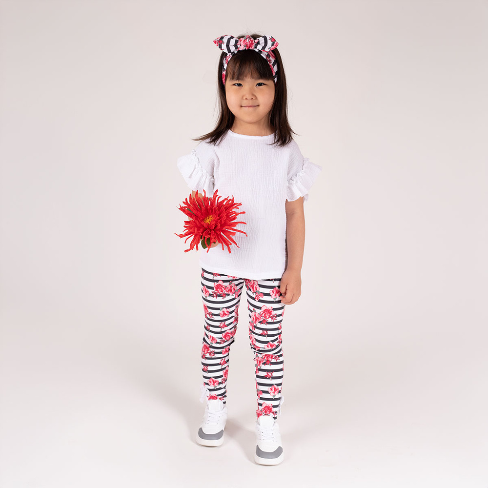 Legginsy dla dziewczynki uszyte z bawełny dresowej z domieszką elastanu, co powoduje, że materiał nie odkształca się, a zarazem jest miły w dotyku. Materiał zdobi wzór kwiatowy w odcieniach różu, a także grafitowe paski. W pasie posiadają wygodną gumkę nie uciskającą brzuszka. Dół nogawek od strony zewnętrznej dodatkowo zdobią kokardki z koronki.
