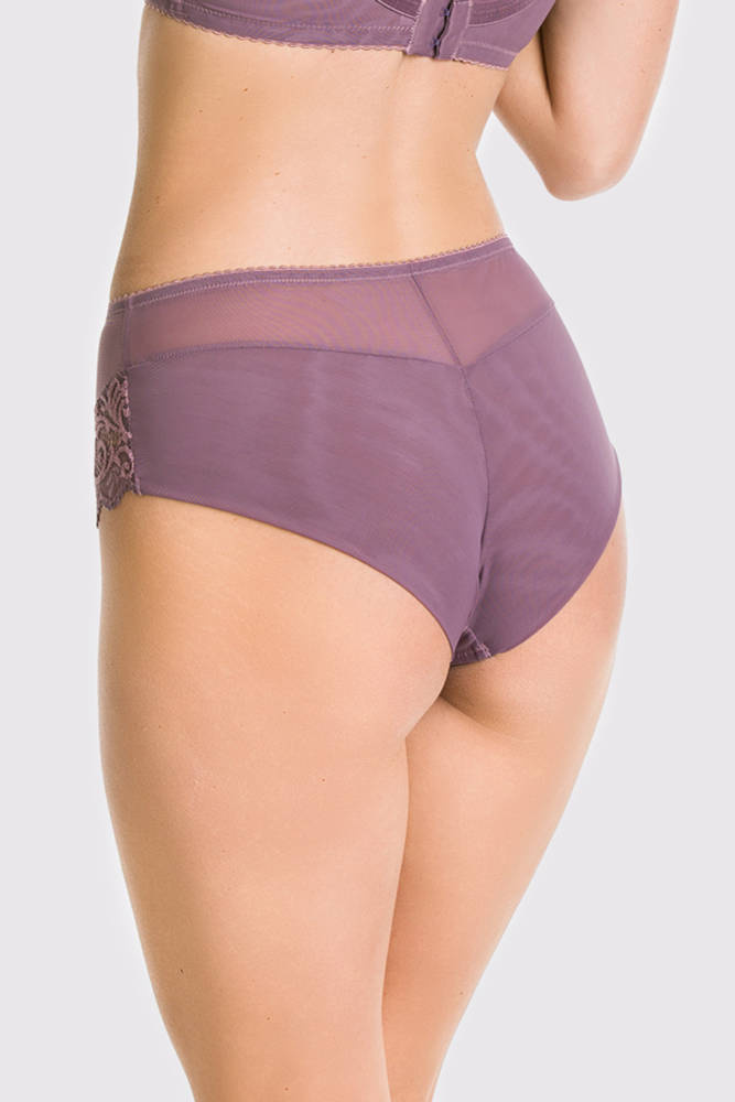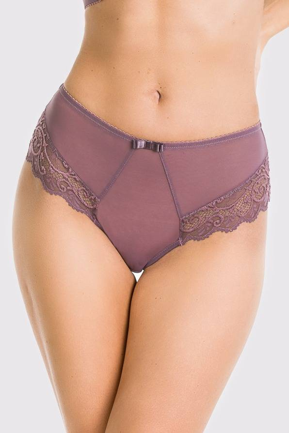 Figi wykonane są z tiulu oraz miękkiej bogatej koronki ,która zdobi przód majtek oraz wypełnia tył dzięki czemu figi nie odznaczają się pod ubraniem.