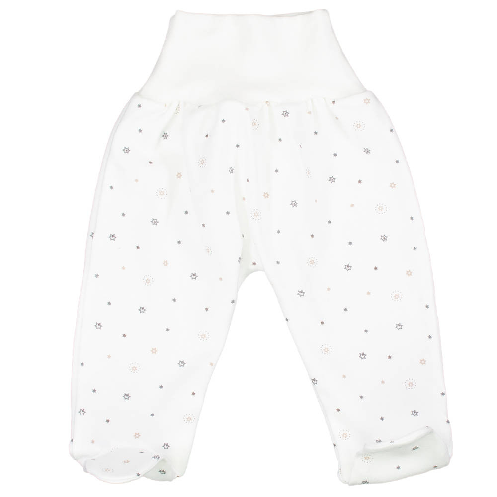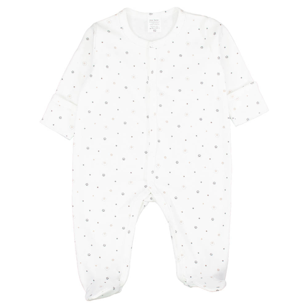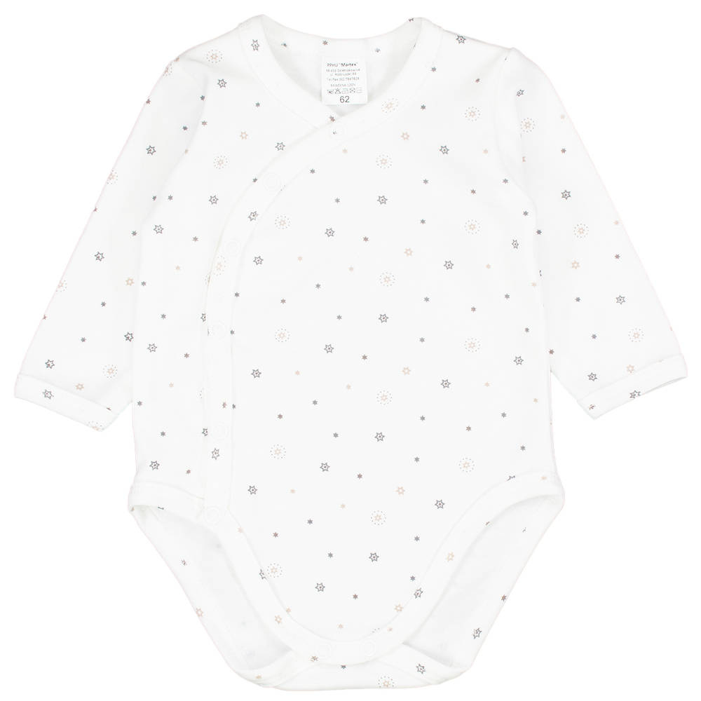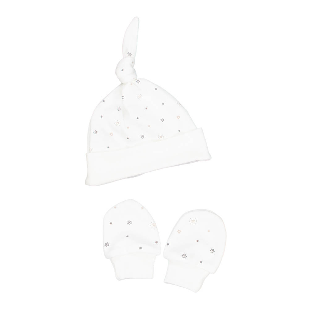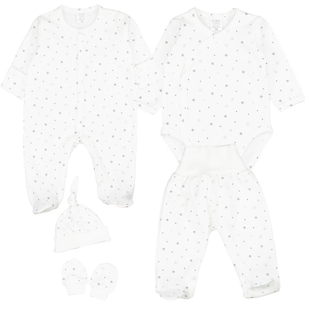Komplet wyprawkowy, w którego skład wchodzi pajacyk z łapkami, body kopertowe, półśpioszek, czapka, łapki niedrapki. Wykonany z mięciutkiej 100% bawełny w delikatne gwiazdeczki. Zapakowany w  pudełko.