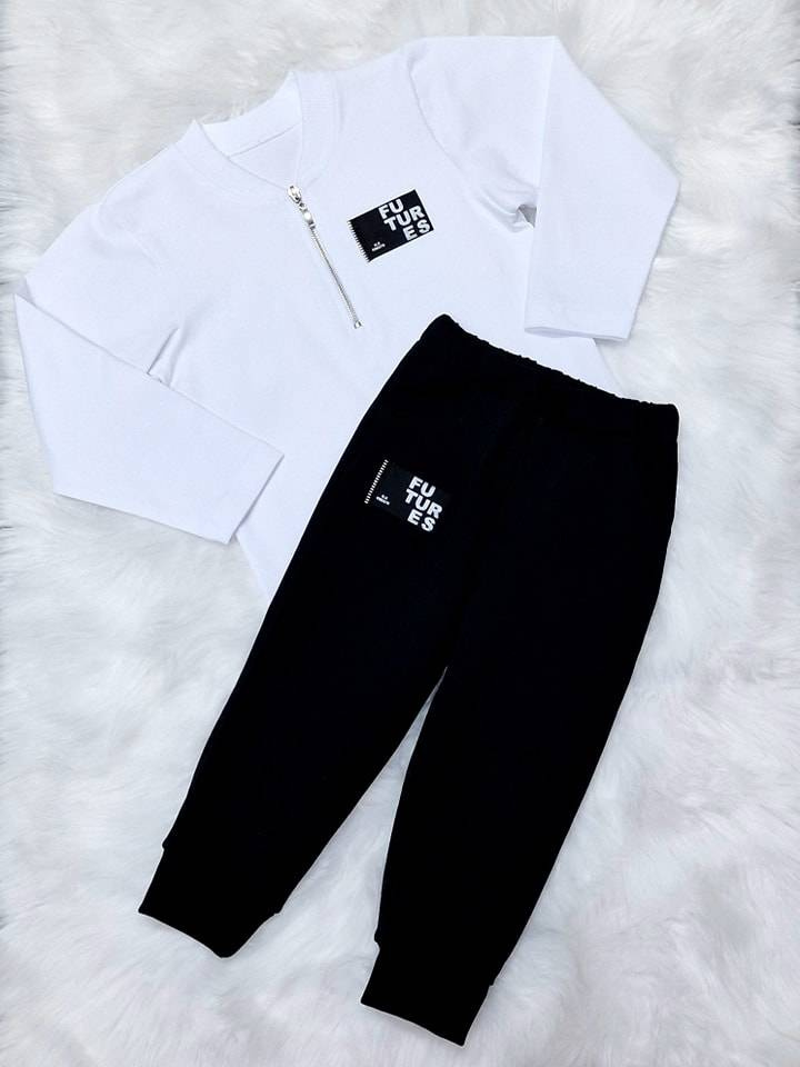 Ozdobiona taśmą z nadrukiem na rękawie. Stylizację uzupełniają spodnie z tej samej kolekcji.