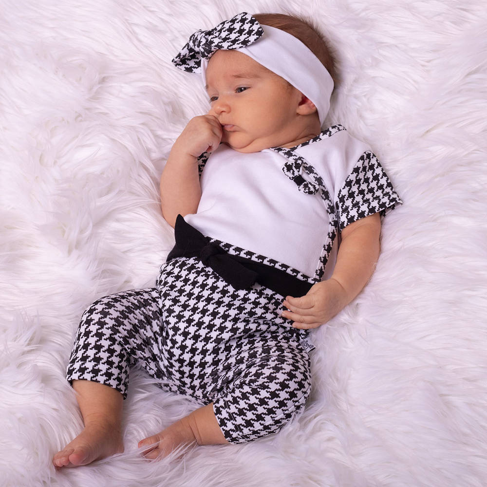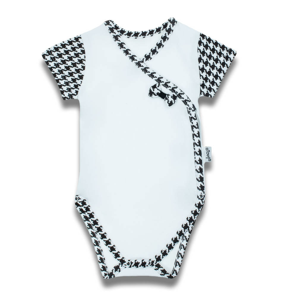 Body kopertowe z krótkim rękawem dla dziewczynki, uszyte z białej bawełny z rękawkami, lamówką w wzór pepitka, dodatkowo przód ozdobiony kokardką również w wzór pepitka. Model ten polecany jest dla noworodków, ponieważ zastosowane zapięcie ułatwia ubieranie dziecka. Zapinane na bezniklowe napy. Materiał posiada certyfikat Oeko-Tex Standard 100 Tekstylia godne zaufania.