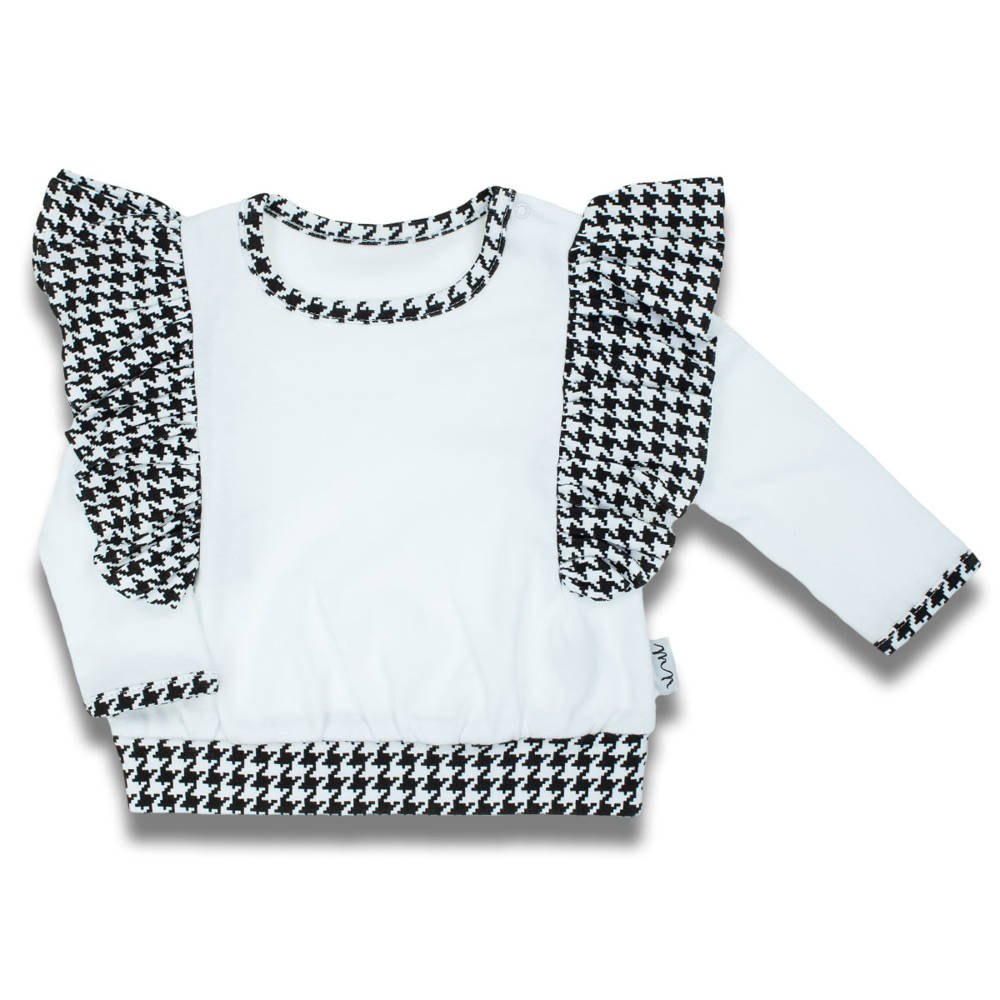 Modna bluzka z długim rękawem dla dziewczynki. Model uszyty z drukowanej bawełny. Materiał posiada certyfikat Oeko-Tex Standard 100 Tekstylia godne zaufania.