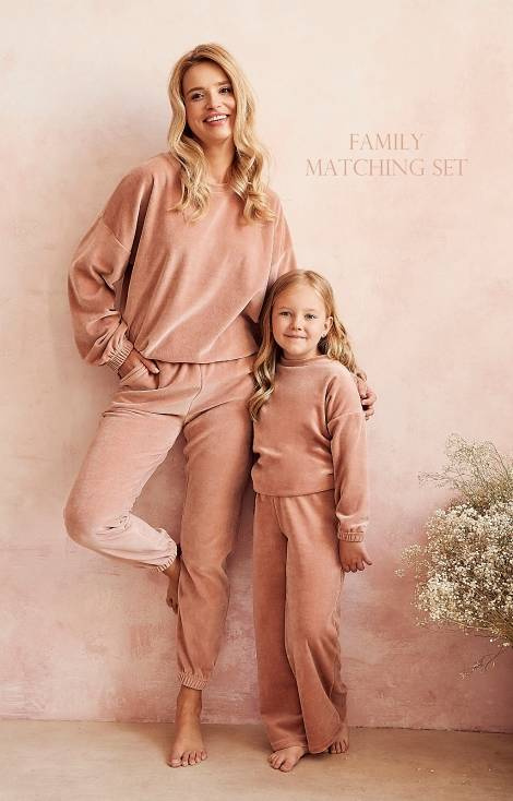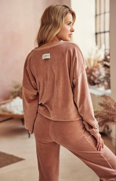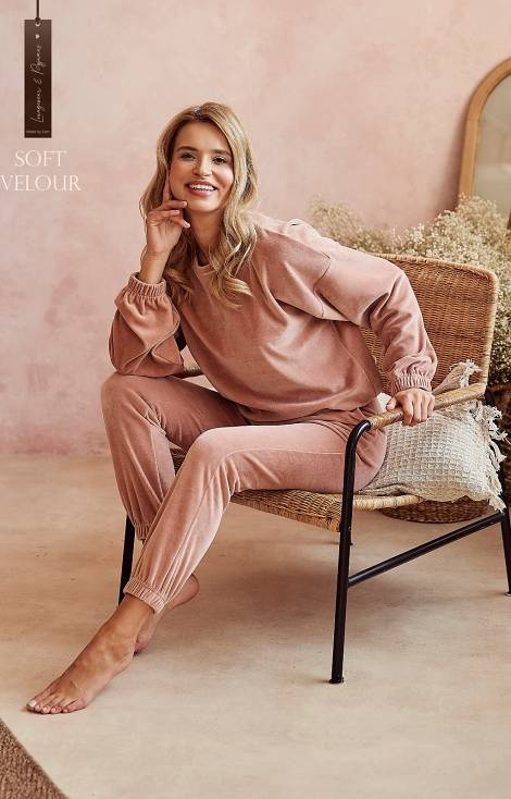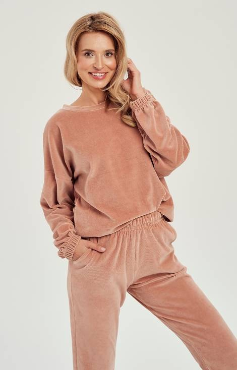 Komplet damski, sportowy. Składa się z klasycznej bluzy oraz długich spodni z kieszeniami. Komplet uszyty z ciepłego weluru.